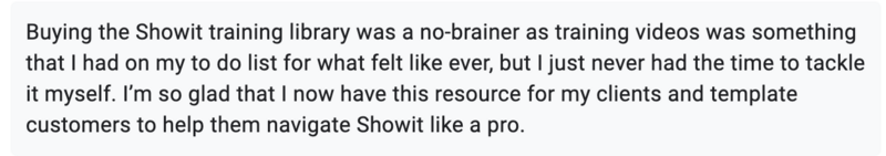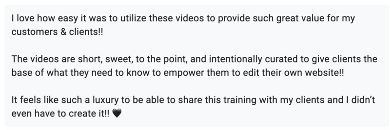 Here's the thing - these videos cover about 90% of the questions clients new to Showit typically ask. (I know from my experience working with designers, and my own custom clients) For that other 10%? You get to be the expert who provides personalized help! It actually makes you look even more valuable, not less.