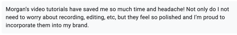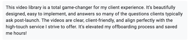 Her custom-hosted video system means our members don’t just get a help center—they get a completely custom, constantly updatable, brandable help center they can plug right into their businesses. No tech headaches, no outdated content, no weird generic vibes.